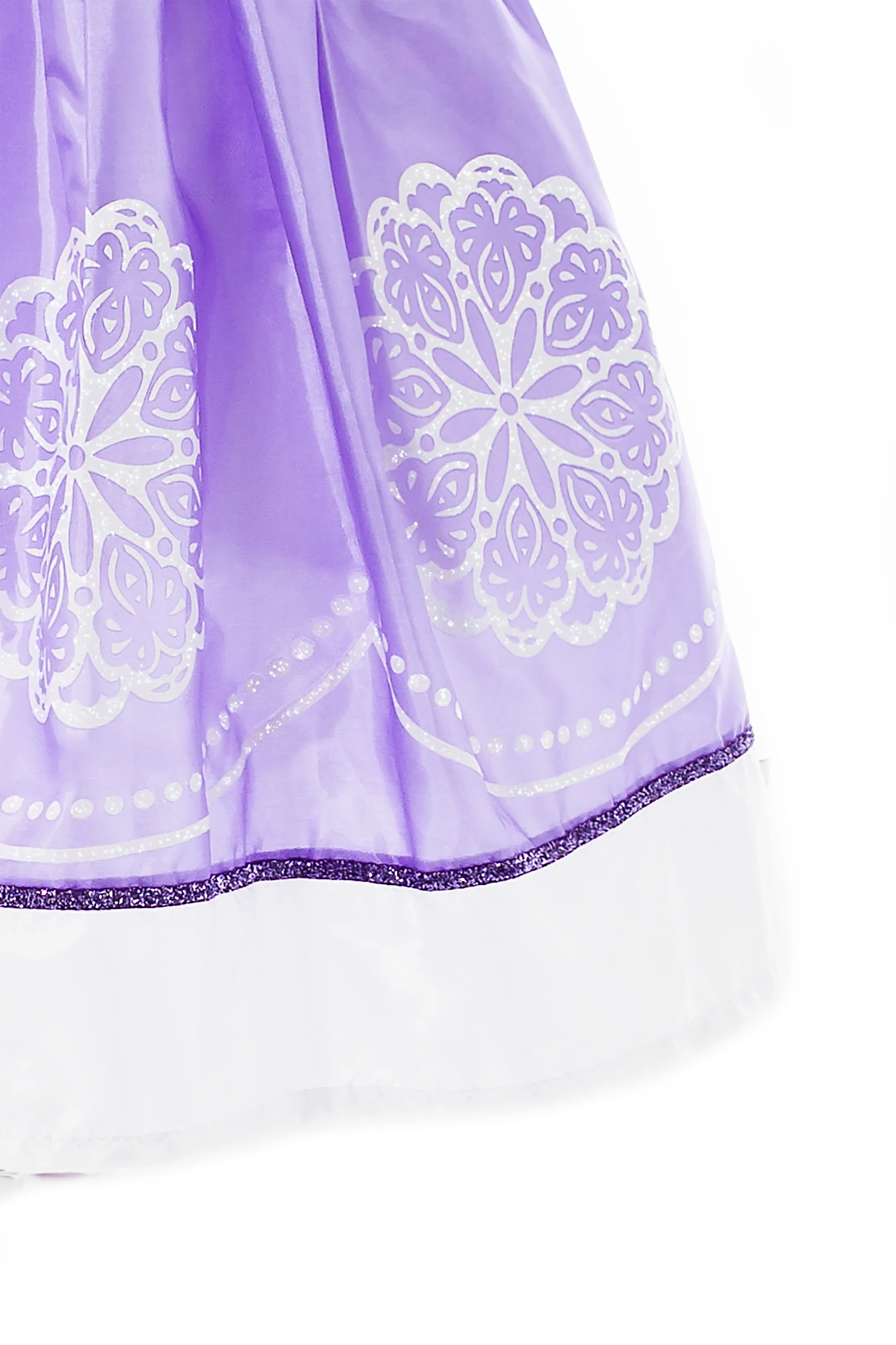 - Purple china silk skirt decorated with delicate white designs and organza hip drapes